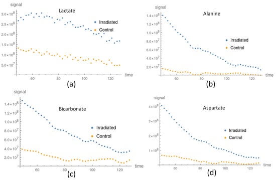 The in vitro metabolite processed signal comparison between the irradiated and control groups: (a) lactate signal in the irradiated (blue) and control (orange) groups; (b) alanine signal in the irradiated (blue) and control (orange) groups; (c) bicarbonate signal in the irradiated (blue dots) and control (orange) groups; and (d) aspartate signal in the irradiated (blue dots) and con-trol (orange) groups.