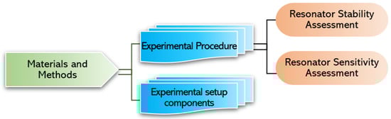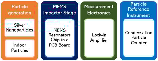 This section is divided into two parts, as shown in Figure 1: first, the different components assembled to construct the experimental setup required to conduct silver nanoparticle deposition and indoor particle deposition, and thereby to characterize the MEMS resonators, are detailed. Second, the experimental procedure for conducting a sensitivity and stability assessment of the MEMS resonators is outlined.