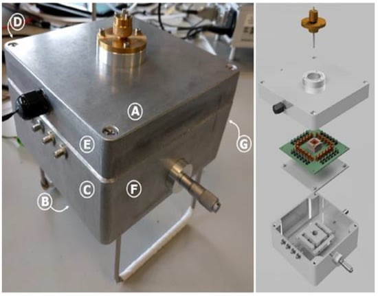 Figure 3 depicts the MEMS Impactor Stage (MIS) used in particle deposition experiments; Figure 3 (left) shows the MEMS Impactor Stage in its sealed position, and Figure 3 (right) shows an exploded view of the MEMS Impactor Stage, with the letters (A–G) corresponding to the location of the inlet, outlet, signal port, redundant port, temperature/RH port, stage alignment control, and camera viewports, respectively. The key parameters of the MEMS Impactor Stage affecting particle deposition on the MEMS resonator surface are the nozzle jet diameter, impaction plate dimensions, throat length of the nozzle, distance between the nozzle throat length and the impactor plate. The MEMS Impactor Stage described herein is designed such that the cut-off diameter indicating 50% collection efficiency is small enough to allow sufficient deposition by impaction [60].