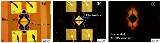 The designed MEMS resonator is fabricated by MEMSCAP Inc., USA in a commercial foundry using a silicon-on-insulator MEMS process [61]. The MEMS die is packaged in a chip carrier, attached to the PCB board, and installed within the MIS. As previously illustrated in Figure 3, the electrical connections to the PCB board are established through the inlet and outlet ports of the MIS and the dimensions of the MEMS resonators are outlined in Table 1.