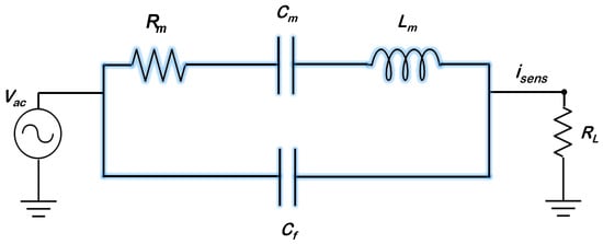 The MEMS resonator can be described by an electrical equivalent consisting of a series LCR circuit [62], as shown in Figure 5.