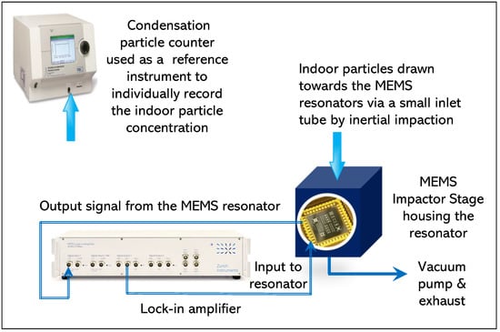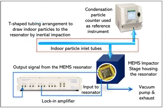 Experimental setup for drawing indoor particles towards MEMS resonators through inertial impaction. CPC and the MEMS resonator monitored indoor particles independently.