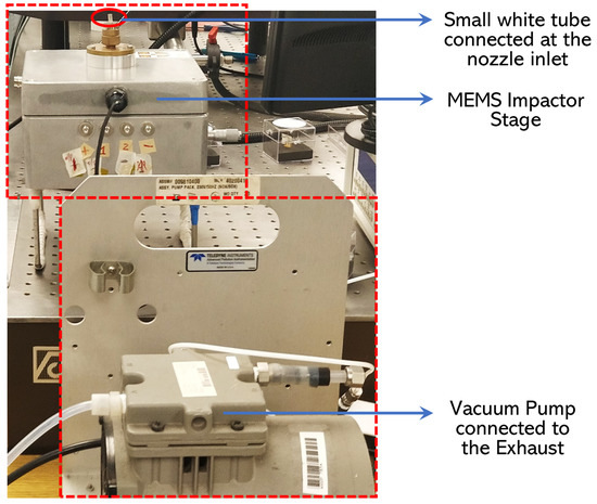 The MEMS resonator is positioned within the MEMS Impactor Stage (MIS) and particle deposition is performed on the resonator surface based on the principle of inertial impaction. In this technique, particles in air flow greater than a certain size will pass through a nozzle inlet to reach the surface of the MEMS resonator acting as the impaction plate. A vacuum pump is connected at the MIS exhaust in order to draw the particles towards the MEMS resonator surface through the nozzle inlet. More details regarding the functioning of the MIS can be found in [7,19,59].