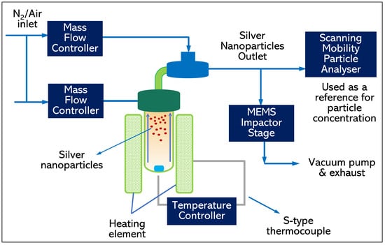 - Hammer, T.; Irwin, M.; Swanson, J.; Berger, V.; Sonkamble, U.; Boies, A.; Schulz, H.; Vasilatou, K. Characterising the silver particle generator; a pathway towards standardising silver aerosol generation. J. Aerosol Sci. 2022, 163, 105978. [Google Scholar] [CrossRef]