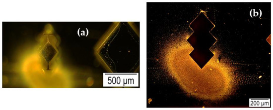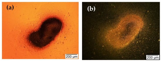As explained in Section 2.1.4, since the first set of indoor particle deposition required a T-shaped tubing arrangement, the indoor particles were first collected on a blank silicon substrate for approximately 3 h. This deposition is to ensure that only indoor particles were collected on the resonator surface and to extract any other type of particles stuck to the walls of the tube from previous particle deposition experiments [5,6,7]. In this experiment, the indoor particles were not size selected, and the bright-field and dark-field images of indoor particles collected on a blank silicon substrate are shown in Figure 13 as microscopic images.