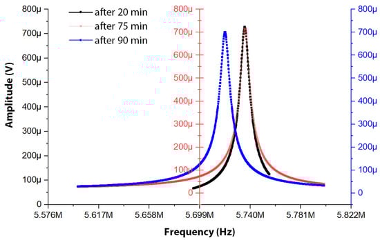 The experimental results depicted in Figure 16 represent the open-loop frequency sweep responses of the MEMS resonator after certain time intervals of deposition as described in Section 2.2.1.