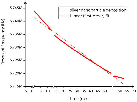 Similarly, the real-time monitoring of the silver nanoparticle deposition is plotted in Figure 17 for the entire time duration of deposition with a few time intervals in between. Throughout the entire time of deposition, a decrease in frequency shift is observed, with discretely stepped frequency shifts tracked by the phase-locked loop of the HF2LI lock-in amplifier.