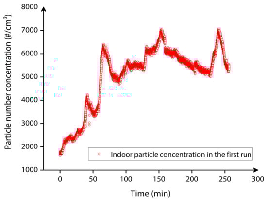 The first set of indoor particle deposition experiment began by depositing indoor particles observed in the room atmosphere onto the MEMS resonator surface for approximately 2.6 h. Initially, the vacuum pump was not turned on to draw the particles towards the resonator surface, and the CPC monitored the indoor particle concentration independently. This step was carried out to determine whether the particle concentration was stable enough for the indoor particles to be deposited on the MEMS resonator surface. When the indoor particle concentration measured by the CPC stabilized after initial 1.5 h, the vacuum pump was activated, and the indoor particles were drawn towards the MEMS resonator surface.