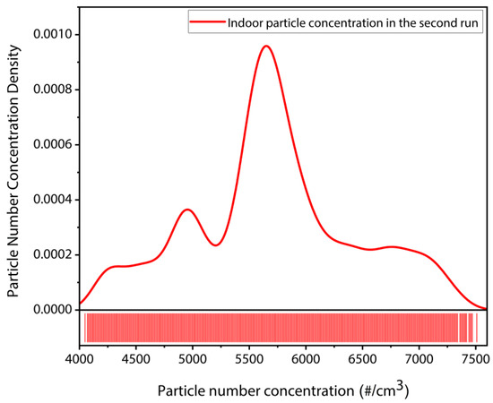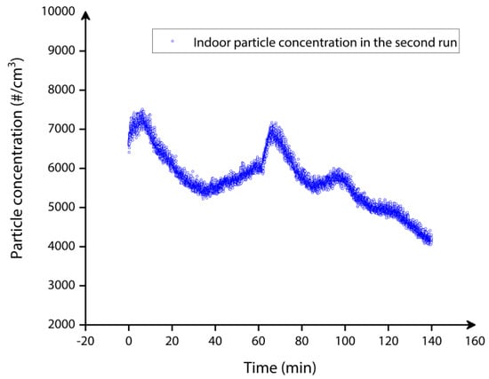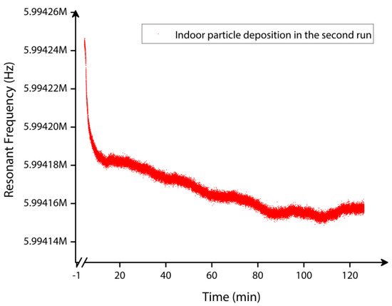 The second type of indoor particle deposition experiments was performed on the MEMS resonator for approximately 2 h continuously, similar to the first set, and the resonant frequency was tracked in real time. The goals of this experiment are twofold: (1) to obtain the deposition of indoor particles on the surface of the MEMS resonator without the use of a T-shaped tubing arrangement and, as a result, to determine the impact of the tubing arrangement on particle deposition, and (2) to continuously monitor the resonant frequency shift data with few time intervals between measurements. Accordingly, the CPC and the MEMS resonator read the indoor particle concentration independently in the second set of indoor particle deposition experiments.