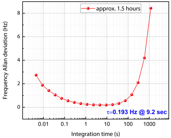 The resonant frequency of the MEMS sensor is impacted by noise processes and environmental conditions due to temperature [66]. The Allan deviation provides a quantifiable measure of the frequency stability of the MEMS sensor under such conditions [67]. The equation that relates the minimum detectable mass and Allan deviation of the output frequency is given by: