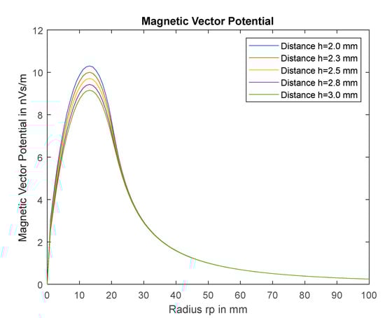 To determine the area of effect, the magnetic vector potential on the plate has been calculated. A flat coil with an inner radius of 2 mm, an outer radius of 20 mm and 18 turns with a wire thickness of 1 mm is used as the excitation coil. The specified current is 1 mA. The metal plate is stainless steel type 1.4301 with a permeability of [25]. For simplicity, is assumed. In Figure 3 it can be seen that the magnetic vector potential reaches its maximum at a radius of 12 mm. Beginning with a radius of 50 mm, the vector potential is only less than 10% of the maximum value and, thus, has hardly any influence on the mutual inductance.