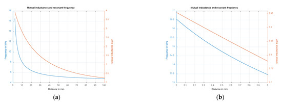 (a) Mutual inductance and resonant frequency for distances h between 2–100 mm; (b) Mutual inductance and resonant frequency for distances h between 2–3 mm.