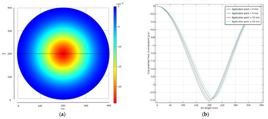 Deflection for light rain. (a) Top view of the plate with deflection as a colormap; (b) Deflection for different application points along the cross section of the plate.