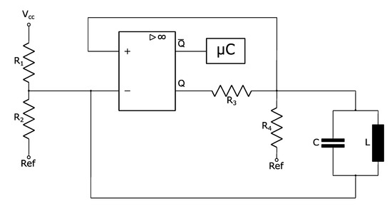 The measuring effect is based on the evaluation of an oscillating circuit frequency. To achieve this, a high-speed and low-power comparator is implemented. The comparator is connected to the excitation coil as shown in Figure 6. To trim the resonant frequency of the oscillating circuit and to reduce interference, a capacitor is connected in addition to the parasitic capacitance of the coil. To lower the current consumption, a parallel LC-oscillator was chosen as it has a high impedance at the resonant frequency. Besides the permanent excitation of the oscillating circuit by the output of the comparator, the comparator has an additional output , which is directly connected to a microcontroller. The comparator output provides a square wave signal, which is already a digital signal. This has the advantage that no AD conversion has to be performed. By counting the edges of the signal, the microcontroller evaluates the frequency. In order to be able to capture “every drop”, the sample time of a measurement is 10 ms with a resolution of 100 Hz and in a measuring range of 200 Hz–30 MHz.
