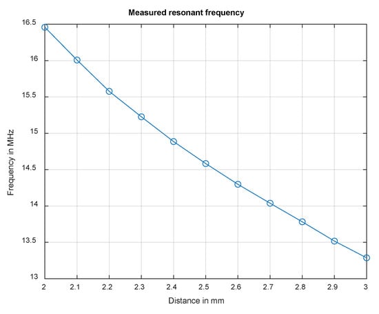 Measured frequency of the resonant circuit for distances between 2–3 mm.
