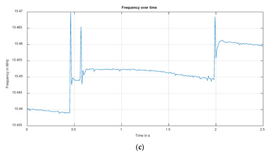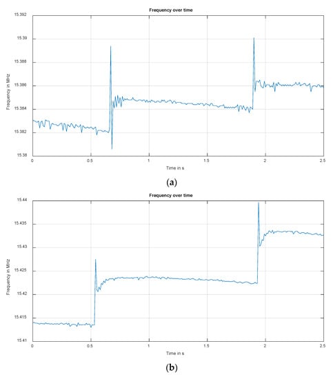 The unfiltered frequency data are presented in Figure 9. In all three cases, the impacts of the water drops are clearly visible. In (a), the droplet with the lowest velocity, and therefore the lowest momentum, creates a frequency change of about 8 kHz. In (b), a change of 15 kHz and in (c) of 30 kHz can be observed. In addition to the pulse, it can also be seen that the base frequency increases slightly after each drop. This is due to the weight of the drop which does not immediately run off the surface. However, it can be seen that between two drops the base frequency slightly decreases. This is due to the drop moving to the edge of the plate and running off.