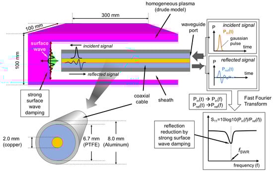 Figure 1 shows a schematic diagram for the simulation configuration. A coaxial cable is partially immersed into a rectangular plasma of dimensions 100 × 100 × 300 mm. The plasma was assumed as a dispersive dielectric material, or more specifically the Drude model provided by the solver. One can find details on the Drude model in []. Briefly, based on the Drude model, the plasma dielectric constant can be calculated by the electron density (), collision frequency (), and microwave frequency (f). Here, is calculated with the same assumptions as in [], and the sheath is assumed as a vacuum (the relative dielectric constant of the sheath is unity). In fact, the sheath is an ion-space charge region (rigorously not a vacuum) but in terms of microwave, of which frequency is much higher than ion plasma oscillation frequency, ions are immobile and therefore the sheath can be assumed as a vacuum. In this simulation condition, , , and sheath width are variables.
