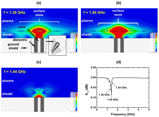To analyze the basic characteristics of the SWR, a simple simulation model was employed with a thick ground shield 300 mm in diameter and other parameters the same as those in Figure 1. Then, the plasma–sheath interface near the coaxial cable becomes flat and the surface wave propagation on the interface is clearly visualized as shown in Figure 2a–c, which show the magnitude of the absolute electric field with a cross-sectional view at /2 phase and different frequencies. Based on Figure 2a,b, a surface wave is generated from the plasma–sheath interface. It can be noted that the magnitude of the electric field at a frequency of 1.40 GHz is significantly large, indicating that the surface wave at this frequency is strongly localized at the interface and absorbed by the plasma. This minimizes the amount of the reflected waves. Such a result corresponds to the simulation result that the minimum is at 1.40 GHz, as shown in Figure 2d. The surface wave disappears at higher frequencies (>1.40 GHz), as shown in Figure 2c, which implies that the dispersion relation of the surface wave no longer exists above 1.40 GHz and, hence, this frequency indicates the SWR frequency []. Furthermore, this frequency is significantly close to the SWR frequency theoretically defined as = [,] at an infinite boundary and without collisions, where is the plasma oscillation frequency (); this theoretical SWR frequency is about 1.42 GHz. It can therefore be concluded that the resonance frequency at which the S value is minimum is the SWR frequency.