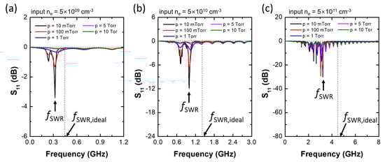 Through the last section, it can be verified that the SWR induces the minimum S value. Now, this section further analyzes the SWR frequency based on the configuration shown in Figure 1. Figure 3 plots the S spectra from 0 to 10 GHz with various input electron densities and pressures at a constant sheath width of 0.234 mm. At a low input of , one can find a sharp resonance peak near 0.3 GHz and multiple peaks above 1 GHz. The former is believed to be the SWR peak and the others due to standing waves formed inside the coaxial cable based on an electric field analysis, which is not included in this paper as it is considered out of scope. As shown in Figure 3a–c, both the SWR frequency and the Q-factor (sharpness of the peak) increase with increasing input . As mentioned previously, at the SWR condition, the surface wave is localized at the plasma–sheath interface and absorbed by the plasma, leading to an abrupt drop in S at the SWR frequency. These wave confinement and absorption effects increase at higher electron densities, with the signal reduction at the SWR frequency becoming stronger.