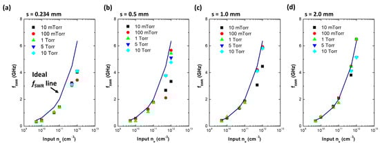 Furthermore, the Q-factor abruptly decreases with increasing pressure, as shown in Figure 3. At high-pressure conditions, electrons barely interact with electromagnetic (E/M) waves due to frequent collisions between argon atoms and electrons, and consequently the wave absorption by the plasma becomes inefficient. As a result, the wave confinement effect decreases and the S reduction at the SWR frequency becomes weaker. Figure 4 plots the calculated over input at various pressures and sheath widths. The dashed line in each plot indicates the ideal SWR frequency as defined by = 6349. At a thin sheath width (Figure 4a), there is a large difference between the ideal SWR and the calculated . The maximum discrepancy (defined as ) is 36.5% at an of . This is because of the boundary effect, which is not included in the ideal SWR model. At a thin sheath width, the E/M wave damped along the plasma–sheath interface interacts with the plasma as well as with the ground aluminum tube of the coaxial cable. As the sheath width increases, interaction between the E/M wave and the plasma becomes dominant and corresponds to the ideal SWR frequency for most pressure conditions, as shown in Figure 4d. Through the E/M wave simulation, it is verified that the sharp resonance peak in the S spectrum of the MOLE probe originates from the SWR and values of can be inferred by measuring the SWR frequency by the relation . However, depending on the sheath width, the measurement discrepancy may increase up to 36.5%.