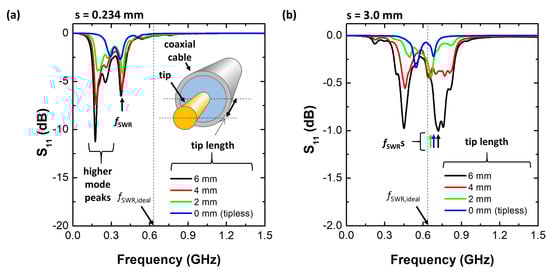 As mentioned in the Introduction section, the principle of the MOLE probe is the same as the PAP [,,], except for probe configuration: the PAP has a radiating tip whereas the MOLE probe is tipless, as shown in Figure 1. This difference seems to be trivial, just either presence of the tip or not, but we found that there is a significant difference in terms of practical use. In general, the S spectrum of the PAP shows multiple resonance peaks caused by higher resonance modes as in [,] whereas the MOLE probe exhibits just double peaks. In fact, these multiple peaks are already addressed in [] where the sensitive PAP was proposed to minimize higher mode peaks. We found, however, that the sensitive PAP is not effective under different conditions. Figure 5 shows simulated S spectra with various tip lengths at different sheath widths of 0.234 mm and 3.0 mm. As shown in Figure 5a, multiple peaks caused by higher mode resonances [] show higher S values compared with the fundamental peak (). In practical situations where one determines the in a measured S spectrum, higher mode peaks would result in a large measurement discrepancy of measurement or require additional analytic processes. The higher mode peaks are however suppressed with lessening the tip length and at the tipless condition, S spectrum shows clear double peaks or a single peak, depending on conditions. Similarly, at the thick sheath condition (Figure 5b), one can find a complicated S spectrum as well as peaks with the probe tip whereas, at the tipless condition, clear double peaks are observed. The simulation result ensures that the MOLE probe exhibits a clear and simple S spectrum and as a result, easy analysis to infer electron density () just by using the equation, = 6349. Furthermore, as the MOLE probe has a flat antenna, it is applicable for plasma monitoring installed on the vacuum chamber wall, which is the main purpose of the MOLE probe.