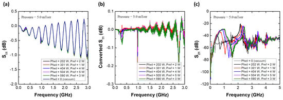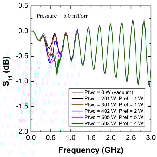 Figure 7 shows the S spectra of the MOLE probe with various rf powers at 5.0 mTorr. A peak appears near 0.5 GHz with the probe at various rf powers (201–593 W) and pressures (5.0–18.2 mTorr) depending on the rf power; based on the simulation analysis, this peak is believed to be the SWR peak, with the other peaks above 1 GHz thought to originate from the standing wave resonance formed inside the coaxial cable. Since these peaks complicate the analysis, converted S spectra [defined as S(plasma) − S(vacuum)] are introduced in Figure 8a–c. With these, the SWR resonance can be more clearly observed. The SWR frequency is proportional to the rf power, and as the pressure increases, the Q-factor of the peak abruptly decreases. As shown in Figure 8d–g, the cutoff frequency () in S, which is marked with an arrow at each rf power condition, is proportional to the rf power [,,]. This implies that the electron density is also proportional to the rf power. Combining the findings of the converted S analysis and S analysis, the SWR frequency as well as the signal reduction are proportional to the electron density. Moreover, the Q-factor of the SWR peak decreases with increasing pressure. These trends are exactly the same as those in the simulation analysis. The dependence of the SWR frequency as well as the cutoff frequency on the rf power is further analyzed by considering the wall-positioned MOLE probe results, as follows.