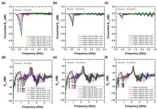 (a–c) Converted S spectra [defined as S(plasma)–S(vacuum)] of the MOLE probe. (d–f) S spectra of the cutoff probe at various rf powers (201–593 W) and pressures (5.0–18.2 mTorr).