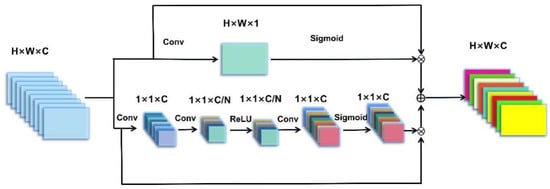 where is the global feature of size . and are the weights of the network mapping. In order to obtain the features of the network channel, convolutional mapping is used, and the feature points before mapping are r times after mapping, so , . is the ReLU activation function, and is the sigmoid activation function.
