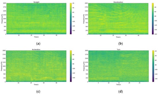 To study the recognition effect of camResNett under different Doppler frequency shifts, four different working conditions were intercepted in each class of experimental data. Each class of the data obtained has four modes of operation: straight ahead at a constant speed, straight forward acceleration, straight-ahead deceleration, and turning. Figure 4 shows the spectrogram of different working conditions by the fourth type of vessel.