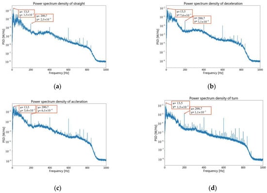 Figure 5 shows the power spectrum density by the fourth type of vessel. A set of resonant waves at a fundamental frequency of 200 Hz occur stably under four different operating conditions. High-frequency points are shifted when the vessel is in an accelerated motion. The high-frequency spectral density varies significantly, and the low-frequency spectral density is more stable than the high frequency under different working conditions. Figure 5b,c show the acceleration and deceleration. Compared with Figure 5a, the power spectral density in high frequency is higher than in the straight motion, and some frequency points in the high frequency are changed. Figure 5d shows turning, and many spectral density power spikes appear in the high frequency compared with Figure 5a.