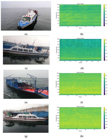 The pictures and spectrograms of the different vessels. (a) the pictures of class I vessel. (b) the spectrogram of class I vessel. (c) the pictures of class II vessel. (d) the spectrogram of class II vessel. (e) the pictures of class III vessel. (f) the spectrogram of class III vessel. (g) the pictures of class IV vessel. (h) the spectrogram of class IV vessel.