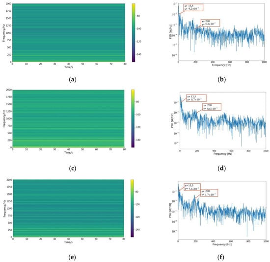 The spectrogram and power spectrum density of Class IV with camResNet. (a,c,e) The spectrogram of extracted features for Class IV vessel by camResNet; (b,d,f) The power spectrum density of extracted features for Class IV vessel by camResNet.