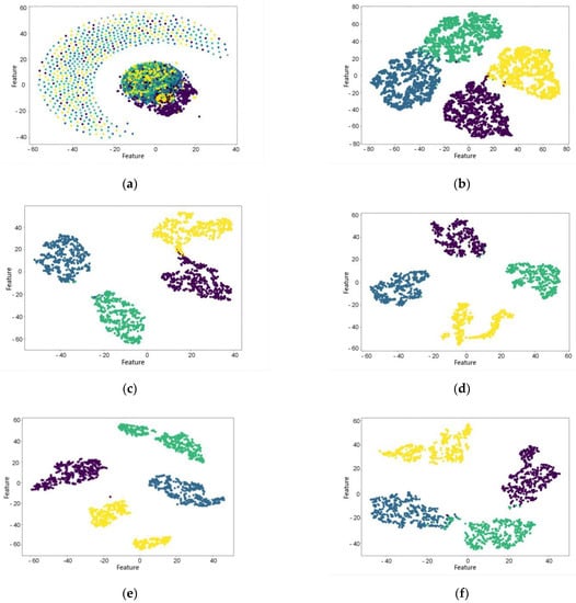The t-SNE visualized graphs. (a) The t-SNE visualized graphs of original hydroacoustic signal; (b) The t-SNE visualized graphs’ output by camResNet; (c) The t-SNE visualized graphs of straight motion by camResNet; (d) The t-SNE visualized graphs of accelerating motion by camResNet; (e) The t-SNE visualized graphs of decelerating motion by camResNet; (f) The t-SNE visualized graphs of turning movement by camResNet.