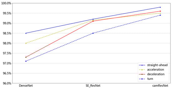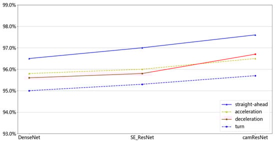 - The maximum recognition rate of camResNet is 0,976; the minimum recognition rate is 0.965. The maximum recognition rate of DenseNet is 0.957, and the minimum recognition rate is 0.95. The recognition rate of the camResNet model is higher than that of the DenseNet model and the SE_ResNet model, and the performance is most evident under the deceleration condition.