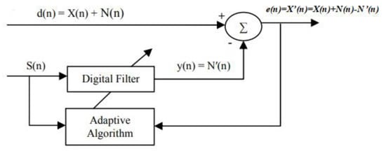 Figure 1 demonstrates the working principle of the adaptive filter in noise cancellation. In adaptive noise cancellation systems, the objective is to produce a system output X’(n) that is the best fit in the least squares sense to the signal X(n) by feeding the system output back to the adaptive filter and adjusting the filter through an adaptive algorithm to minimize total system output power []. The adaptive filter contains a digital filter with adjustable coefficients and the adaptive algorithm to modify the values of coefficients for filtering each sample. The coefficients of the digital filter are continuously changed according to the chosen adaptive algorithm so as to minimize the mean squared value of the error signal e(n). The reference signal S(n) is fed into a digital filter to produce an output N’(n), which is as close as possible to the replica of the noise N(n). Subsequently, this filtered signal output y(n) is subtracted from the primary input d(n) to obtain the estimated desired signal X’(n) []. As can be seen from Figure 1, the performance of an adaptive filter in noise reduction is mainly determined by the adaptive algorithm and the reference input.