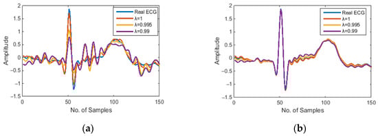 Least mean squares (LMS), Normalised Least Mean Squares (NLMS), and Recursive Least Squares (RLS) are the three most commonly used algorithms in adaptive filtering. In our preliminary trials, we found the three adaptive algorithms LMS, NLMS, and RLS are all capable of removing motion artifacts from the noisy ECG signal, but their noise reduction performance varies with the selection of the step size , or the forgetting factor . In our proposed adaptive motion artifact reduction method, we adopted the RLS algorithm because it provides a faster convergence speed. Furthermore, the forgetting factor of the RLS algorithm was reduced from 1 to 0.99 to improve the tracking ability of the adaptive filter. However, the reduction of forgetting factor will sacrifice the stability of the algorithm and thus cause a high-frequency noise in the denoised ECG, as demonstrated in Figure 2a, so we added a 5 Hz low-pass filter to the estimated noise N’(n) to reduce the unwanted high-frequency components, the results of the denoised ECG using an RLS adaptive filter and a 5 Hz low-pass filter are shown in Figure 2b. The cut-off frequency of the low-pass filter was set to 5 Hz because the main spectral range of the motion artifacts we wanted to suppress is 0–5 Hz [].