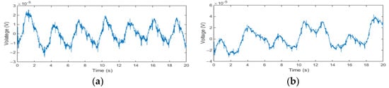 As can be seen in Figure 5a, the measured IP signal contains not only the respiratory impedance signal but also the cardiac-related artifacts, as the transthoracic electrical impedance varies with both respiration and cardiac function []. The respiratory impedance signal is caused by the changes in lung volume during respiration because an increase in the amount of air in the lung reduces electrical conductivity. The cardiac-related artifacts [] are mainly generated by changes in the blood volume during every cardiac cycle and have some correlation with ECG signals. In addition to the cardiac-related artifacts, the IP signal is also susceptible to body movement, as can be seen in Figure 5b. Changes in chest shape and/or in the skin-electrode impedance caused by body movement can produce large motion artifacts in the IP signals. In some cases, the motion artifacts are higher than the respiratory-related signals.