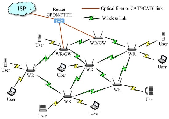 Wireless communication is now one of the most common solutions in network technology. At the access layer, WMNs are commonly used in the local area networks of government agencies, businesses, schools, and hospitals, etc. [1,2]. Figure 1 depicts the general architecture of the WMN, in which nodes are connected via a wireless transmission channel to form a mesh topology. Mesh client (MC), mesh router (MR), and mesh router with gateway (MR/GW) are the three types of nodes in the WMN. To access the internet, the MCs connect to the MRs or MR/GWs via a wireless communication medium.