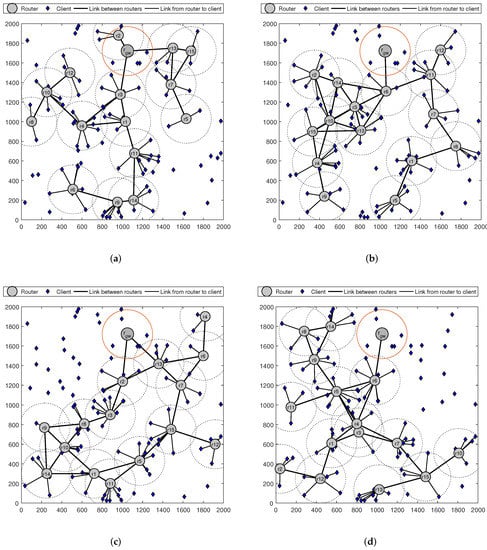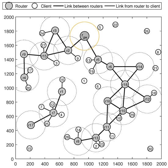 To better understand the concepts of connected routers, consider the example shown in Figure 2, where a WMN consists of 18 mesh routers, 30 mesh clients and 1 gateway router (), located in an area of 2000 × 2000 meters. For the current state, mesh routers and are connected routers because there are paths from these mesh routers to the gateway router . The mesh routers , and are not connected routers because there is no path from these routers to the gateway router.