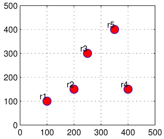 This solution is the placement positions of five routers , , , and at coordinates (100, 100), (200, 150), (250, 300), (400, 150) and (350, 400), respectively. The locations of these routers are illustrated in Figure 3.
