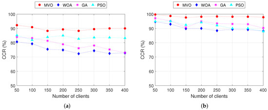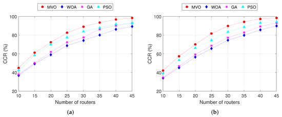 The results obtained in Figure 5 show the effect of the number of mesh routers on CCR, where we plot the CCR as a function of the number of the mesh routers. These results are obtained when executing INS-1 and INS-2. We can observe that the higher the number of mesh routers, the higher the CCR for all algorithms, where the CDR is the best for the case of the MVO algorithm. For example, consider the INS-1 (Figure 5a) with 30 mesh routers; the CCRs when using algorithms MVO, WOA, GA and PSO are 89.1%, 74.4%, 77.5% and 83.9%, respectively. Thus, the CCR of algorithm MVO is greater than that of algorithms WOA, GA and PSO by 14.7%, 11.6% and 5.2%, respectively. For the INS-2 (Figure 5a), the CCR is smaller than INS-1 due to the larger number of clients (350 clients). However, algorithm MVO always yields higher CCR than other algorithms. The details of the CCR values when executing INS-1 and INS-2 are shown in Table 6.