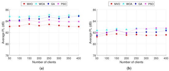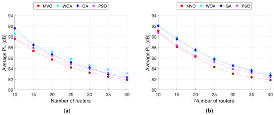 Next, we analyze the PL in WMN. As described in the previous section, PL is the signal power loss between the mesh client and the nearest mesh router, calculated according to (15). This is an important performance measure that greatly affects the quality of transmission (QoT) in WMN. The smaller the PL, the better the QoT. The results obtained in Figure 6 show the average PL in the entire network when executing INS-1 and INS-2 simulations. We can observe that the higher the number of mesh routers, the smaller the average PL for all algorithms, where the average PL is the best for the case of the MVO algorithm. This is because the larger the number of mesh routers, the higher the CCR (as analyzed in Figure 5), leading to a decrease in the average distance from the mesh client to the nearest mesh router. As a result, the average PL decreases. Comparing INS-1 (Figure 6a) and INS-2 (Figure 6a), we can observe that INS-1 performs better than INS-2 in terms of average PL. In other words, when the number of mesh clients is moderate (150 for this case), the QoT in the whole network is better than that of the case where the number of mesh clients is heavy (350 for this case). Comparing between four algorithms, MVO algorithm always gives the best QoT, and the difference in average PLs compared to algorithms WOA, GA and PSO are about 1.3, 0.9 and 0.6 dB, respectively.