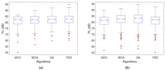The box plots in Figure 7 show the distribution of PL values for all clients. These results are obtained through INS-1 and INS-2 simulations with 40 mesh routers. We can observe that the MVO algorithm gives better PL than other algorithms for both INS-1 and INS-2. Considering the results of INS-1 (Figure 7a), the PL of the MVO algorithm ranges from 70.4 to 86.1 dB. In addition, there are four outliers of 55.1, 63.5, 68.8 and 69.1 dB. Meanwhile, the PL of algorithms WOA, GA and PSO range from 70.8 to 89.7 dB, 72 to 92 dB and 72 to 94.7 dB, respectively. There are also some outliers between 60.5 and 71 dB. Thus, the PL of the MVO algorithm is better than that of the WOA, GA and PSO algorithms.