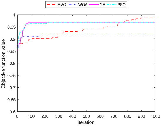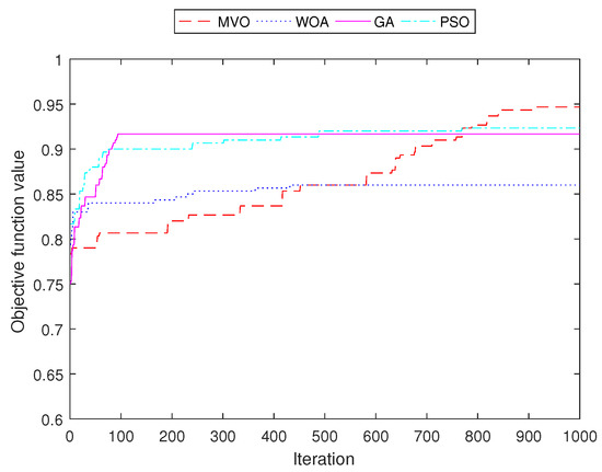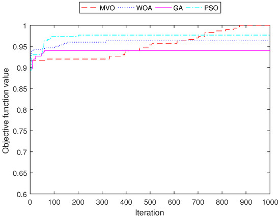 MVO is a population-based algorithm that searches in two stages: exploration and exploitation. The MVO algorithm considers solutions to be universes and variables within a solution to be variables within a universe, where d represents the number of objects, n represents the number of universes, is the j-th parameter of the best universe formed so far, the TDR factor is calculated by Equation (10), the factor is calculated by Equation (9), shows the lower bound of the j-th variable, is the upper bound of the j-th variable, indicates the j-th parameter of the i-th universe, and are random numbers in [0, 1]. Equations (11) and (12) are used to update the universes. In addition, each universe is given an inflation rate () based on the fitness function value for that universe, is the normalized inflation rate of the ith universe. The MVO algorithm is demonstrated in Algorithm 1.