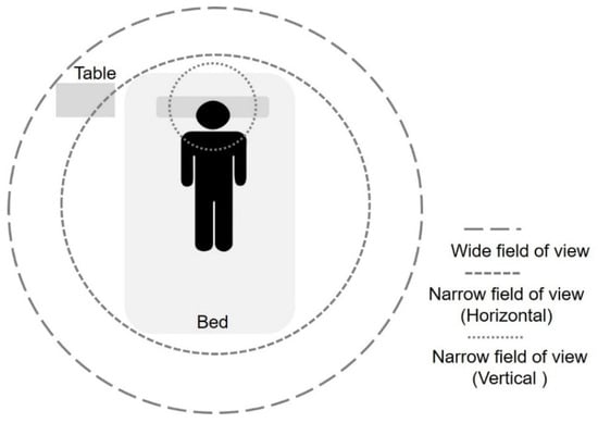 Figure 1 illustrates different object tracking ranges to monitor bed-related behaviors in the ward environment. A wide field of view tends to obtain more activity information by covering as wide an area as possible. Consequently, WFV images can contribute to the effectiveness of behavior recognition and are beneficial to tracking various behaviors such as bed exit and falling. IBy contrast, a narrow field of view aims to cover an area of interest where only the target is active and can obtain a simple scene for behavior recognition purposes.