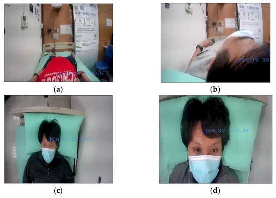 Figure 2 shows the NFV system prototype used in this paper. The main components consist of a primary device, a secondary device, and a mobile stand. The primary device is in charge of user input (buttons and microphone), user output (display and speaker), and communication (Wi-Fi and call bell socket). On the other hand, the secondary device is connected to a camera and receives images to conduct the behavior recognition process. The recognition results are then sent to the primary device for the potential follow-up notification to the institution. Both primary and secondary devices are attached to the mobile stand. Accordingly, this prototype provides a post-installation feature and can be deployed or removed as required. Furthermore, the camera device can be adjusted as shown in Figure 2b,c to capture NFV images from various angles. Figure 3 presents images captured from four different angles: horizontal high, horizontal low, vertical high, and vertical low. Referring to Figure 1, the horizontal angles cover the bed region, while only a portion of the body is covered in the images captured by vertical angles. From Figure 3, it can be seen that NFV images with limited spatial information can impede object identification and tracking, and user activities become unpredictable.