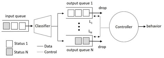 Figure 4 presents a status classification queueing (SCQ) system proposed in this study to realize the behavior recognition stage for NFV images. The proposed SCQ system consists of four components: input queue, classifier, output queue, and controller. The input queue and output queue are data buffers with a queue structure. That is, the buffered data are processed in a first-in-first-out manner. The data unit is the activity status from the status classification stage. Each status result enters the input queue and is then assigned by the classifier to one among N output queues according to its status. That is, the status i is in the output queue i with a length Li. Meanwhile, the controller drops one status from the head of its output queue to manage the number of buffered statuses in SCQ. The number of statuses, M, can be regarded as a status window size specified by a time slot of T seconds: