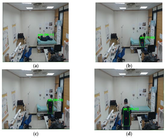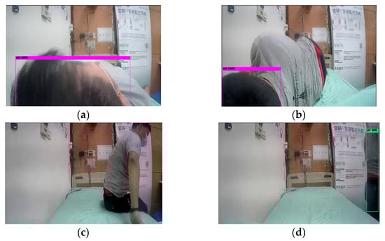 This section describes a bed-exit application based on a three-stage behavior recognition system, for NFV images captured by the prototype shown in Figure 2. In the object detection stage, Yolov4-tiny is adopted to identify the head and trunk of a monitored user. As the object is detected in an NFV image, a bounding box with the position information of X and Y coordinates can be available to the status classification stage. Figure 5 shows the object detection results for NFV images captured from the horizontal low angle. Figure 5a–d indicates a series of bed-related activities including laying on the bed, turning over, getting up, and walking away from the bed. In Figure 5a–c, the detected objects are the head labeled in the pink bounding boxes, while Figure 5d detects the human trunk labeled in the green box.