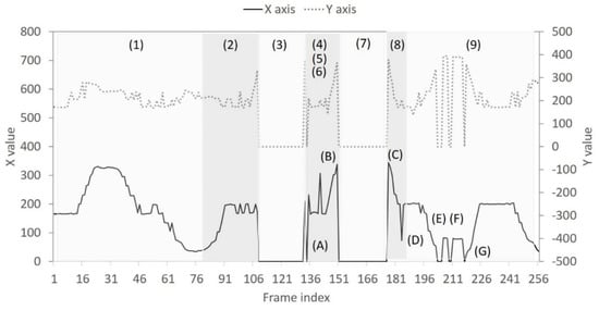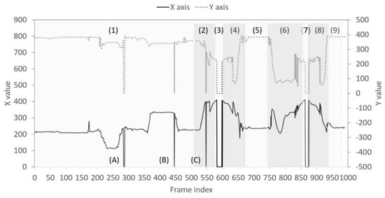 Real−time trace of XY coordinates for the bounding box from the horizontal low angle: numbers (1)~(9) stand for different statuses; letters (A)~(C) represent detection failure events.