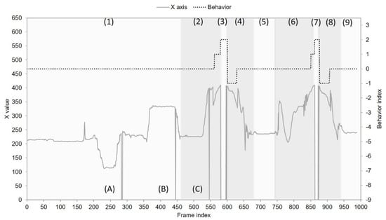Behavior index trace from the horizontal low angle: numbers (1)–(9) stand for different statuses; letters (A)–(C) represent detection failure events.